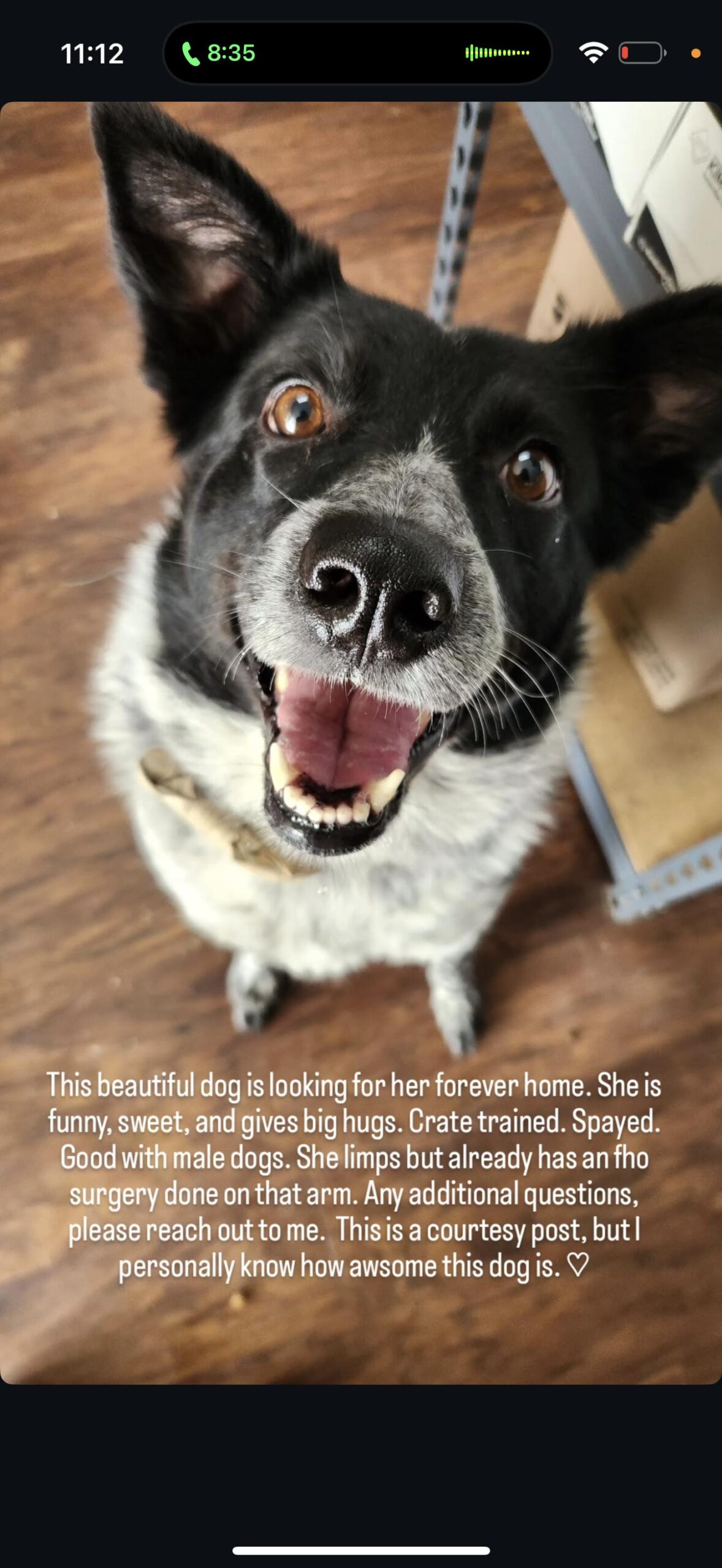 She is good with our other male cattle dogs. She limps on her left arm but already has an FHO surgery done on that arm and it is sound. She is approximately 6 years old and 50lbs. Lola’s adoption fee is sponsored! If you feel you can give her a loving home please call for interview and home inspection!